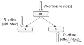 写库不建立索引;线上读库建立线上访问索引,例如uid;线下读库建立线下访问索引,例如time;