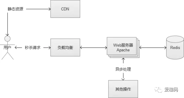 一个秒杀或者抢购页面,通常分为2个部分,一个是静态的HTML等内容,另一个就是参与秒杀的Web后台请求接口。