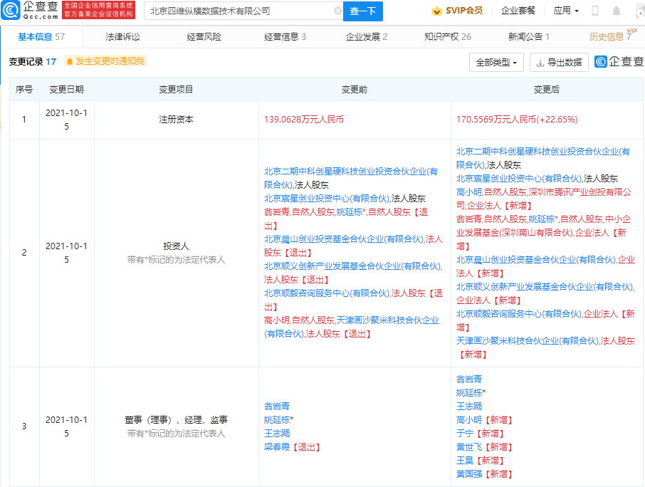 企查查APP显示,10月15日,北京四维纵横数据技术有限公司发生工商变更,新增股东深圳市腾讯产业创投有限公司,同时公司注册资本由139.06万元人民币增加至170.56万元人民币,增幅为22.65%。