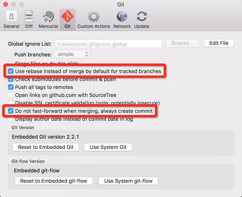 这样设置之后,在点「Pull」按钮拉取代码时会自动执行 git pull --rebase;并且,每次合并时会自动创建新的包含分支信息的提交节点。