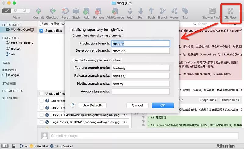接下来,点击工具栏中的「Git Flow」按钮将相关的流程自动化。如果没有特殊需求,直接按下对话框中的「OK」就好了。初始化完成后会自动切换到 develop 分支。