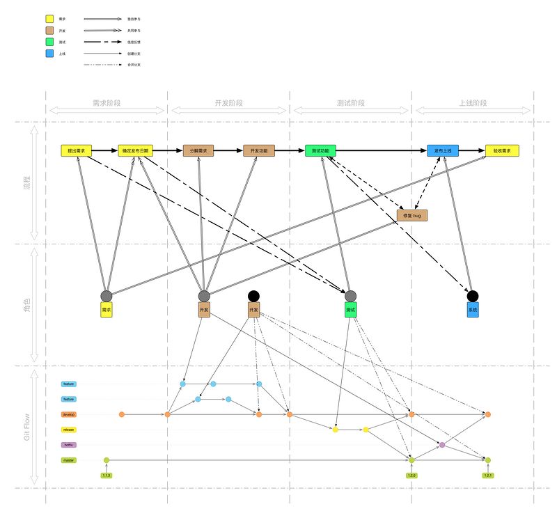 在引入 Git Flow 之后,所有工作都要围绕着它来展开,将原本的流程与之结合形成「基于 Git Flow 的开发流程」。
