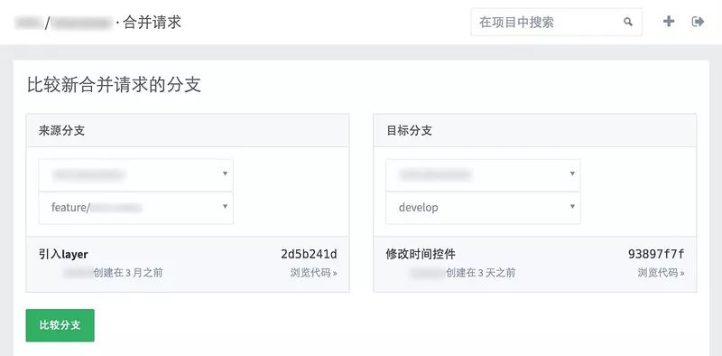 「来源分支」选择要被合并的 feature 分支且「目标分支」选择 develop 分支后点击「比较分支」按钮,在出现的表单中将处理人指派为项目负责人。