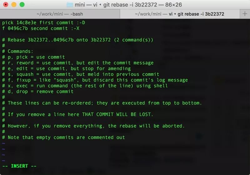 然后,终端中执行命令git rebase -i [SHA],其中 SHA 是上一次提交之前的那次提交的,在这里是 3b22372。