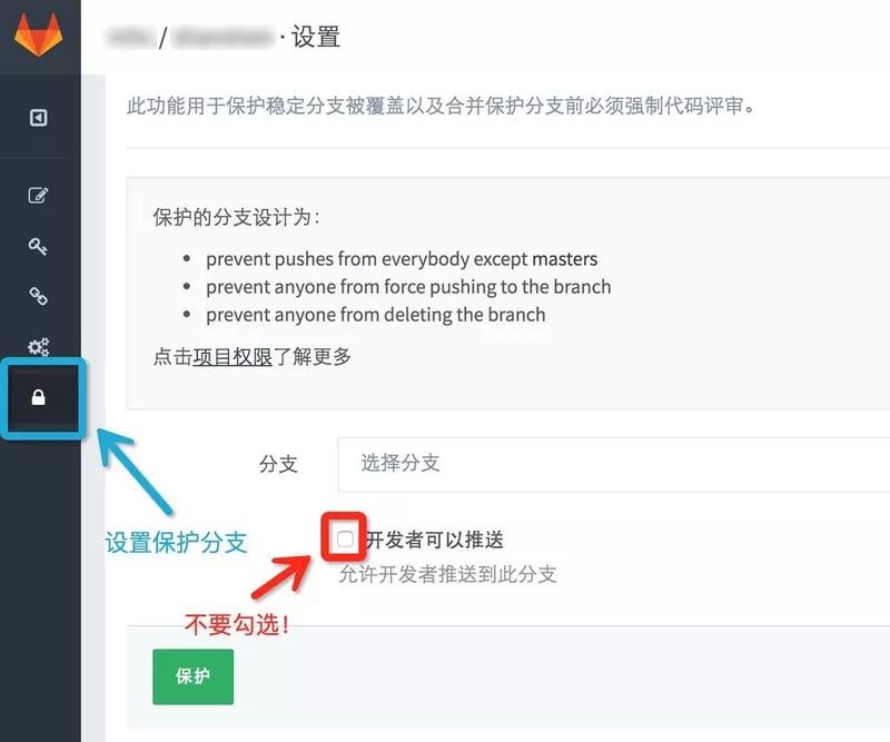 在创建项目仓库后一定要把主要分支,也就是 master 和 develop 给保护起来。为它们设置权限,只有项目负责人可以进行推送和删除等操作。