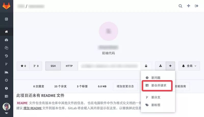 然后,到 GitLab 上的项目首页创建合并请求(merge request)。