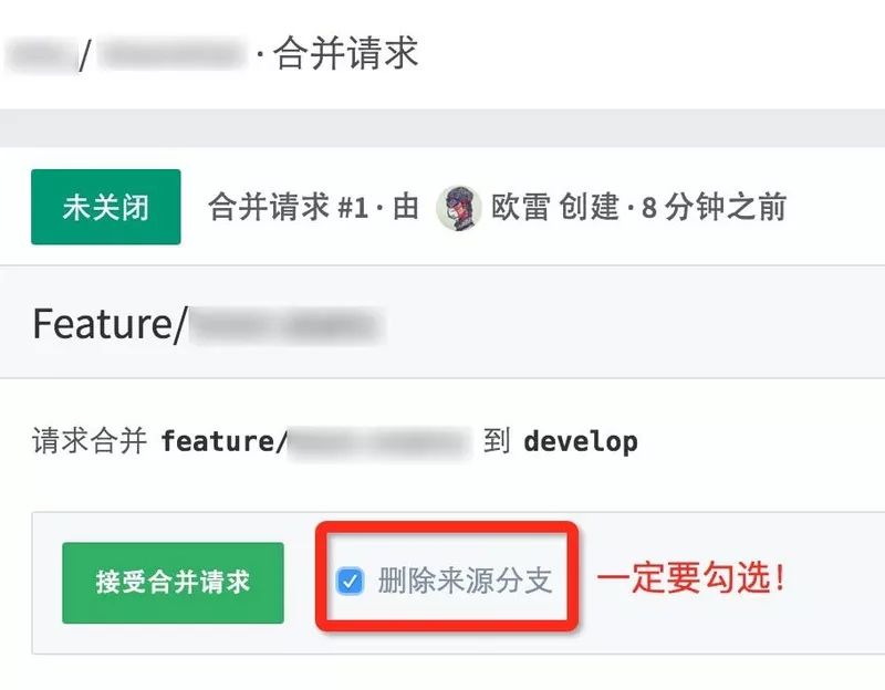 项目负责人在收到合并请求时,应该先做下代码审核看看有没有明显的严重的错误;有问题就找负责开发的人去修改,没有就接受请求并删除对应的 feature 分支。