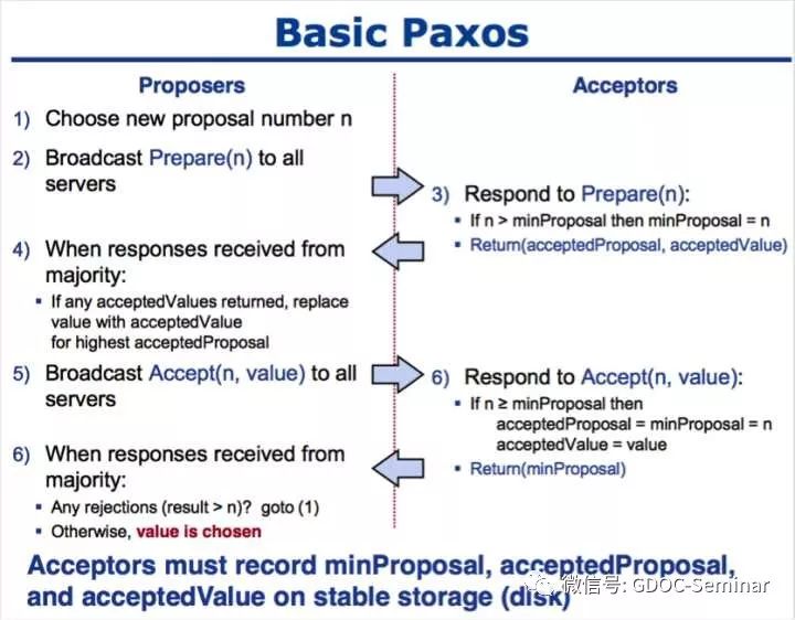 Proposers向Acceptors提出Proposal,为了保证最多只有一个值被选定(Chosen),Proposal必须被超过一半的Acceptors所接受(Accept),且每个Acceptor只能接受一个值。