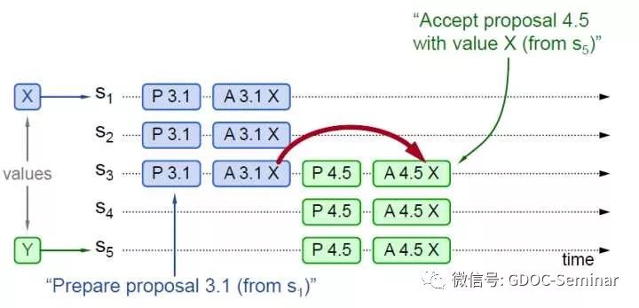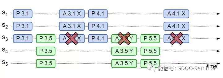 图中P代表Prepare阶段,A代表Accept阶段。3.1代表Proposal ID为3.1,其中3为时间戳,1为Server ID。X和Y代表提议Value。