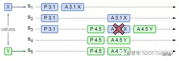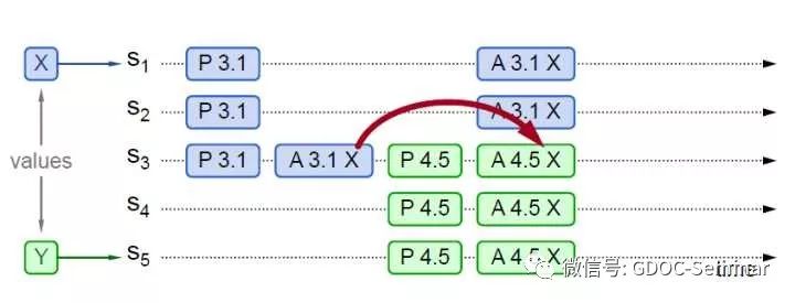 实例2中P 3.1没有被多数派Accept(只有S3 Accept),但是被P 4.5学习到,P 4.5将自己的Value由Y替换为X,Accept(X)。