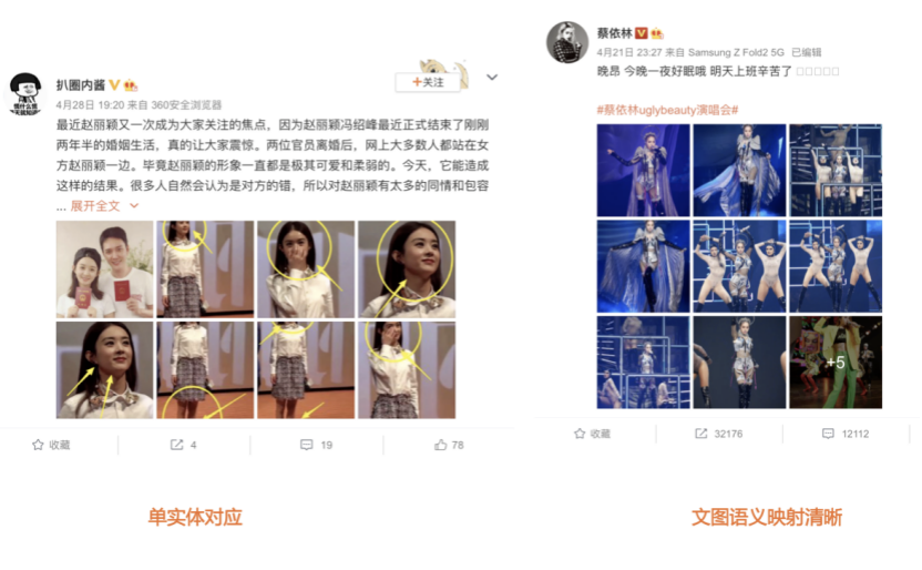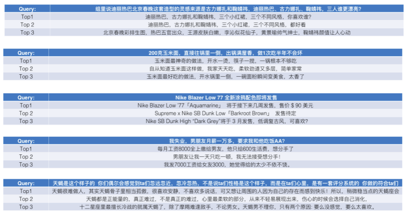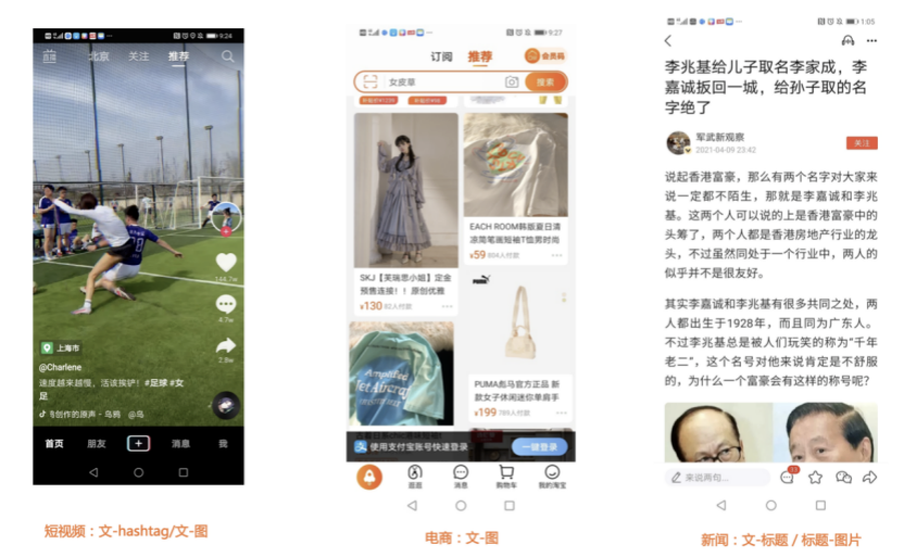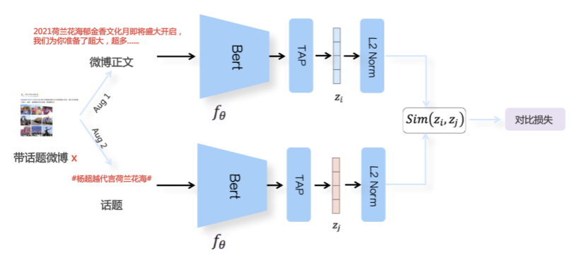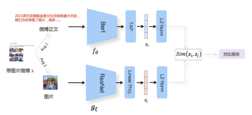 我们先从面向<文档,话题>数据对的对比模型说起。所谓“话题”是什么意思呢?上图给了两个例子,微博中用户打在##符号内的内容,一般在Twitter上管这个叫HashTag,我们内部称之为话题。话题往往是用户使用几个单词组成的,对博文内容进行概括性描述的短语。微博中大约40%的博文是带有用户打上的话题的,但是用户打的话题质量良莠不齐,存在大量蹭热点话题的现象,博文内容和话题不匹配或弱相关的情况较为常见。上图两个例子分别展示了高低质量话题这两种情形。本文说的“文档”,指的是去掉话题的博文内容,后文有时也会称为“微博正文”。也就是说,我们会把微博内容分离成文档和对应的话题两部分。我们希望使用同一微博带有的<文档,话题>数据对作为训练数据,使用对比学习,构造一个表征学习系统,将微博正文和话题映射到同一个语义空间中,在表示空间内,语义相近的正文和话题距离较为接近,而语义不相似的正文和话题距离较远。以此来获得一个针对微博内容的编码器和话题编码器,希望这两个编码器能够给微博内容和话题打出高质量的Embedding。我们称这个利用<文档,话题>数据的对比学习模型为CD-TOM模型(Contrastive Document-TOpic Model),它其实是SimCLR的自然语言处理版本。上图展示了CD-TOM模型的整体结构。仿照SimCLR模型,它由对称的上下两个分枝(Branch)构成,上下两个分枝主体都由Bert模型构成,是基于Bert预训练模型的双塔结构。我们随机从带有话题(#HashTag#)标记的微博训练数据中取N个构成一个Batch,对于Batch内某个微博 来说,在Aug1和Aug2里分别是微博正文和对应的微博话题 ,数据对<, >互为正例,而博文和Aug2里除之外的其它任意N-1个话题都互为负例。同样的,话题和Aug1里除之外的其它任意N-1个微博正文都互为负例。这是CD-TOM模型的正例和负例构造方法,可以看出,采用了典型的Batch内负例。因为上下分枝是对称的,我们仅以博文侧Aug1所经过的上分枝来介绍文本表示映射过程。Aug1内的正文数据,首先经过Bert模型对文本内容编码(这里以函数代表):目前很多研究表明,在做文本表示时,用Bert的[CLS]来表征文本内容效果不佳,所以常常会用Transformer最高层单词对应的Embedding编码(注:如果同时用第一层和最高层单词Embedding效果更好),句中每个单词对应Embedding累加后求均值(TAP, Token Average Pooling),形成博文表示向量。目前对比学习模型研究表明:将原始数据映射到单位超球面,一般这样做效果更好。所以接下来,我们对博文表示向量做L2正则,将其映射到单位超球面上,这样来完成博文的表示映射过程。下分枝的Aug2过程类似,通过相同手段将话题映射到单位超球面上。通过双塔结构,我们期望将博文和话题映射到相同表示空间内。这里,上下分枝Bert采取了共享参数的做法。在模型结构方面,我们曾尝试完全仿照SimCLR,经过Bert表示后,再引入另外一个非线性映射过程,但是实验结果表明第二个非线性结构会导致负向效果,所以在最终结构中,把第二个非线性映射结构拿掉了,我认为这应该是SimCLR和CD-TOM正例构造方法不同导致的模型结构差异。在表示空间内,我们希望正例距离较近,负例距离较远,以此来将表达相同语义的正文和话题映射到一起。我们对博文表示向量和话题表示向量进行点积,以此作为度量函数,来衡量单位超球面上任意两点的距离:而损失函数则采用对比学习常用的InfoNCE,某个例子对应的InfoNCE损失为:其中,<, >代表两个正例相应的表示向量。从InfoNCE可以看出,这个函数的分子部分鼓励正例相似度越高越好,也就是在表示空间内距离越近越好;而分母部分,则鼓励任意负例之间的向量相似度越低越好,也就是距离越远越好。是温度系数超参,用来调节数据在单位超球面上的分布均匀性。这样,在优化过程中,通过InfoNCE损失函数指引,就能训练模型,以达成我们期望的目标,将表达相同语义的微博正文和对应话题映射到空间中接近的地方,和正文表达不同语义的话题在表示空间内尽量推远。上面介绍的是博文-话题的对比学习模型CD-TOM的结构,可以看出,这是一个基于对比学习的,双塔Bert模型Fine-Tuning过程。其实,只要稍加改造,就可以对同一微博内很多不同元素相互之间进行比较与映射,比如我们还可以对博文-图片来进行表示学习。除了正例构造方法和模型小细节外,博文-图片多模态模型的整体结构和CLIP比较接近,所以,我们将这个使用包含大量噪音微博文图数据的多模态模型称为W-CLIP(Weibo-CLIP)。博文-图片对比学习系统W-CLIP的模型结构如上图所示。整体运行机制和CD-TOM模型基本一致,主要区别有两点:首先,构造正例的时候,不再是用同一个微博内包含的<正文,话题>数据对,换成了带图片微博里对应的<博文,图片>数据对,如果一个微博里包含多张图片,则同时构造多个正例。其次,上下分枝由对称结构改为非对称结构。因为图片和博文模态不同,所以下分枝不能使用Bert预训练模型,这里我们采用经过ImageNet预训练的ResNet101模型作为图片的特征抽取器,为了能和文本侧的表示向量进行内积计算,在ResNet最后一层FC之上,套上了一个线性映射层,使得图像表示的维度保持和文本表示维度一致。除此外,整个计算流程和CD-TOM类似。我们经过实验证明,放大Batch Size对于模型效果有较为明显的正向效果,所以通过LAMB优化器,并结合Gradient Checkpointing优化技巧,放大Batch Size到1664。关于大Bat