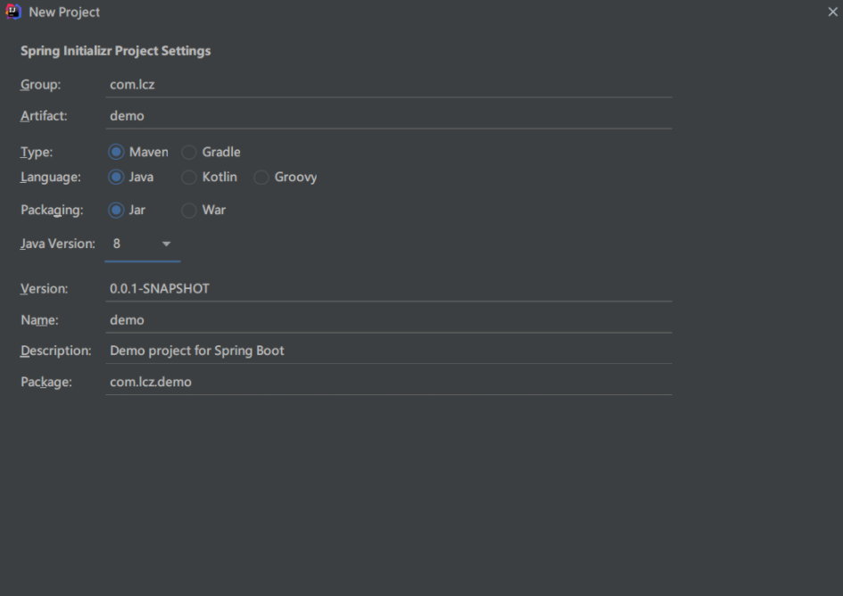 idea 中 File – New Project 选择 Spring Initializr 后填写项目信息,创建工程。