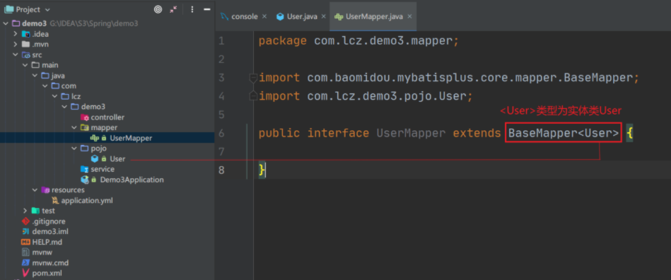 继承 MyBatis Plus 中的 BaseMapper , 在 UserMapper 中使用 MP 中的方法,实