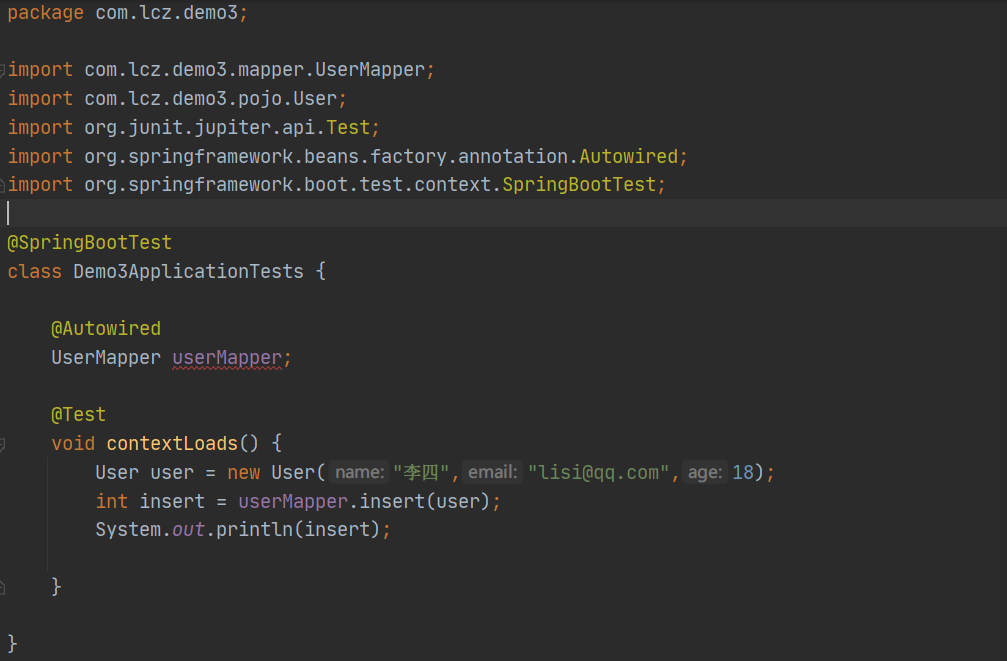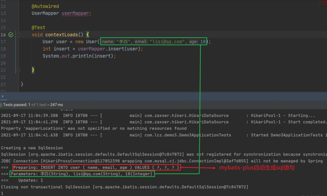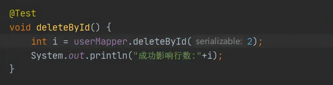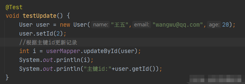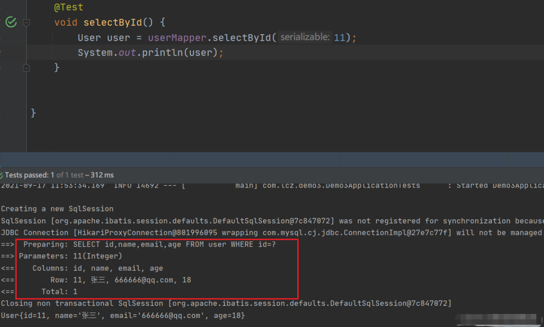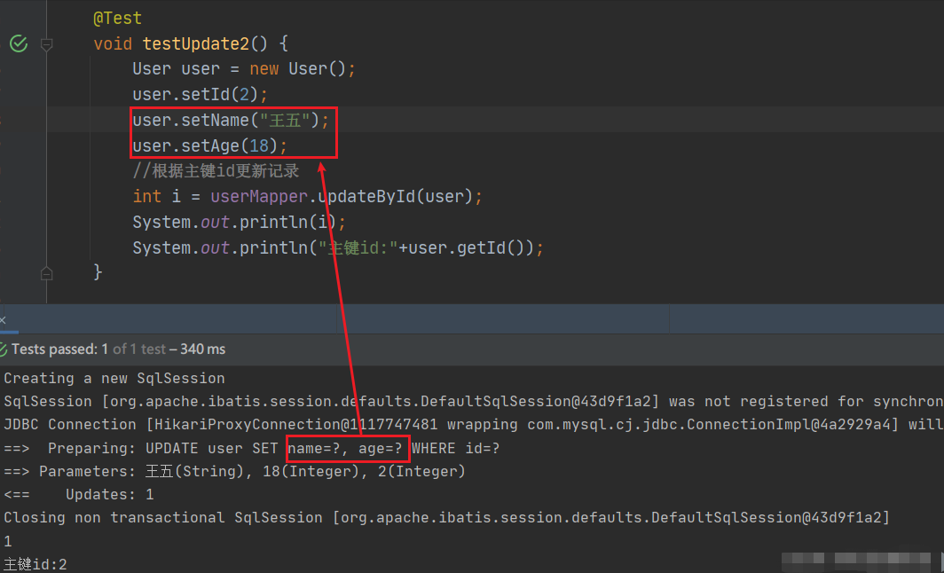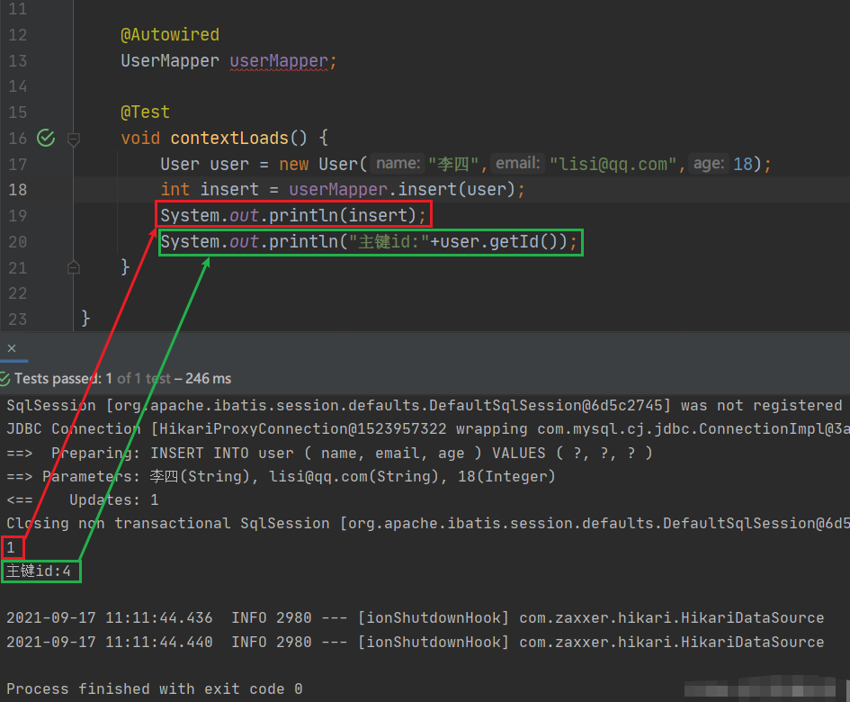 注:insert()返回值 int,数据插入成功的行数,成功的记录数。getId()获取主键值,成功影响行数后会自动将主键值赋值给实体类的主键id。