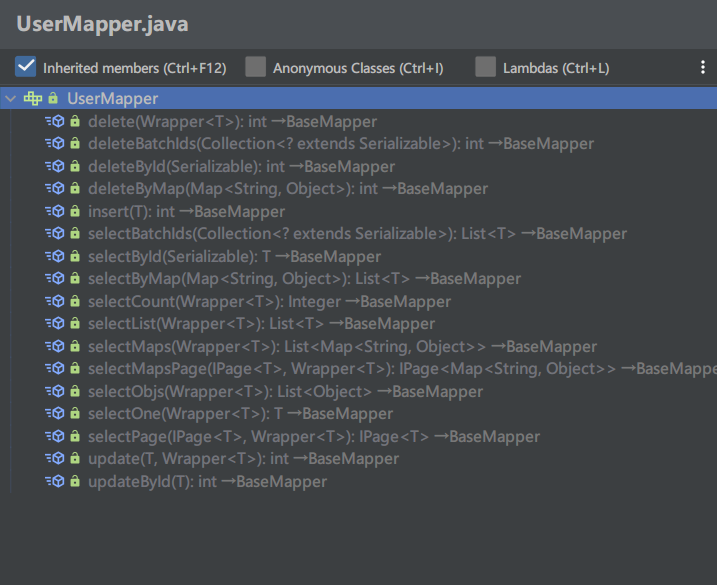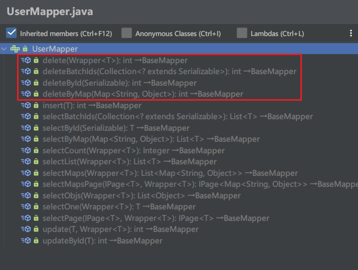 CRUD 的操作是来自 BaseMapper 中的方法。BaseMapper 中共有 17 个方法,CRUD 操作都有多个不同参数的方法。继承 BaseMapper 可以其中的方法。
