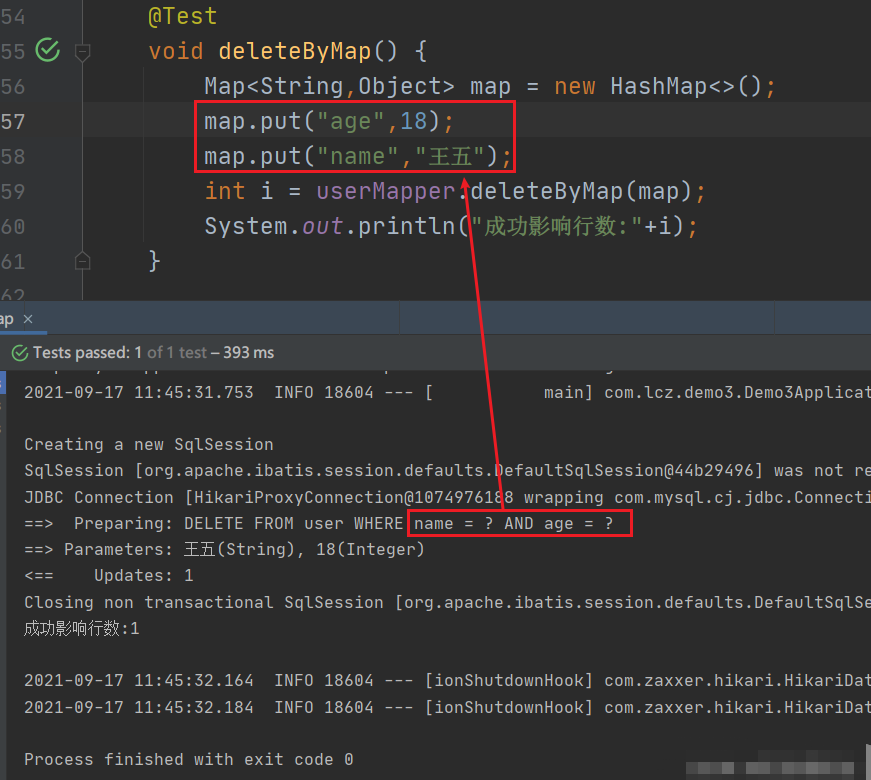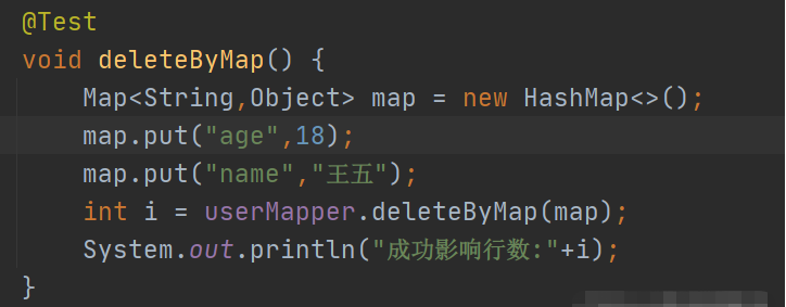 注:删除条件封装在 Map 中,key 是列名,value 是值,多个 key 之间 and 联接。