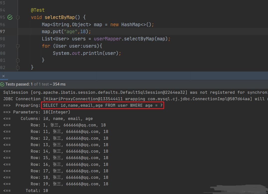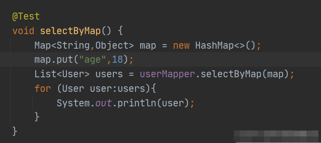 把要查询的条件字段 put 到 Map,key 是字段,value 是条件值。多个条件是 and联接。调用 selectByMap(),传入 Map 作为参数,返回值是 List 集合。