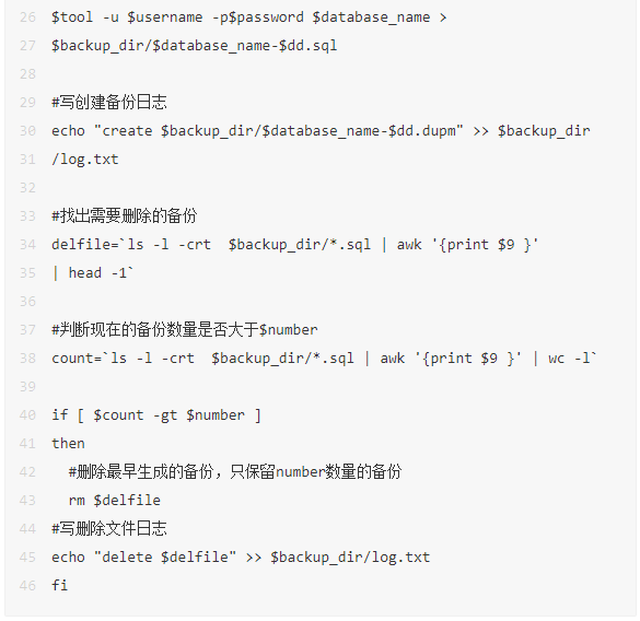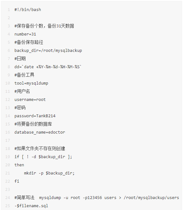 以下代码功能就是针对mysql进行备份,配合crontab,实现备份的内容为近一个月(31天)内的每天的mysql数据库记录。