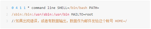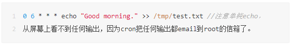 在crontab文件中如何输入需要执行的命令和时间。该文件中每行都包括六个域,其中前五个域是指定命令被执行的时间,最后一个域是要被执行的命令。