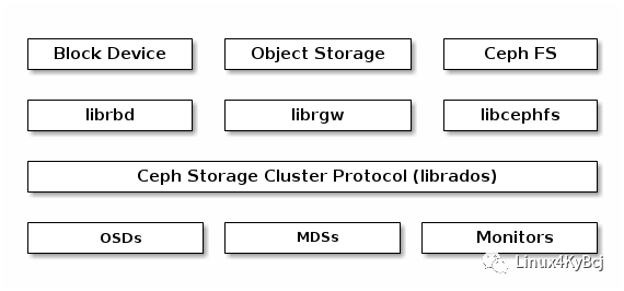 用户可以通过librbd以块设备存储的方式、通过libcephfs以文件存储的方式、通过librgw以对象存储的方式访问Ceph存储系统。