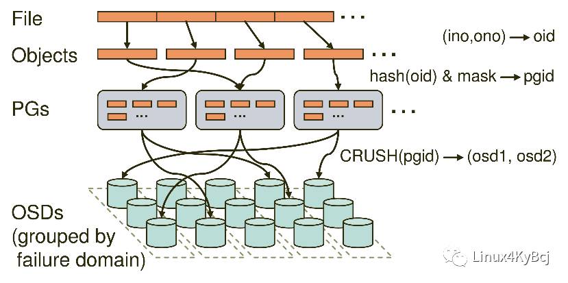 通过文件的inode和对象的编号获得对象的id,然后通过一个简单的hash算法得到对象映射的pgid,最后通过CRUSH算法+集群拓扑信息计算对象存储的osds,获取第一个主osd存储数据,主osd负责副本的备份。
