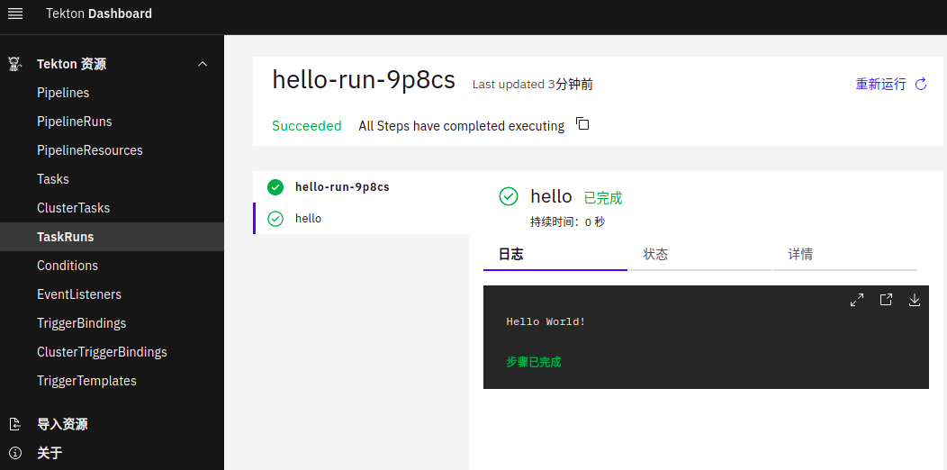 # kubectl create -f taskRun-hello.yaml