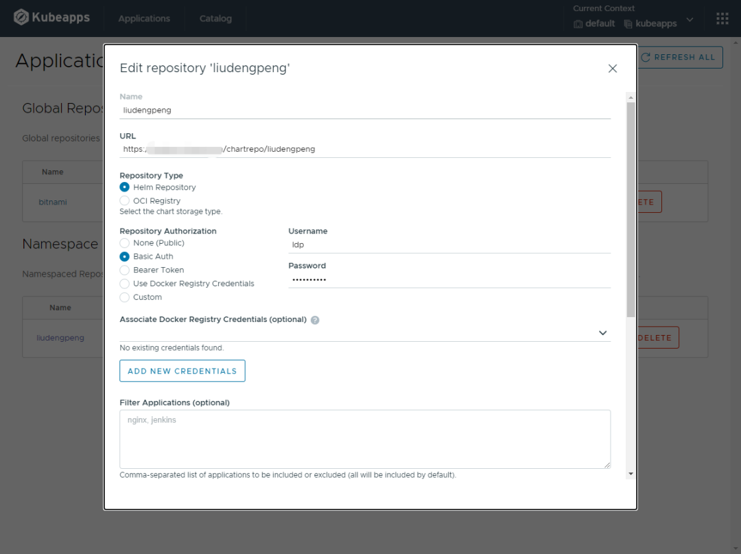 harbor 默认集成了 helm charts ,可以把它加入到 kubeapps 中