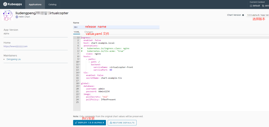 在 kubeapps 中,value.yaml 文件是可编辑的,编写 chart 时使用 {{- toYaml . }}