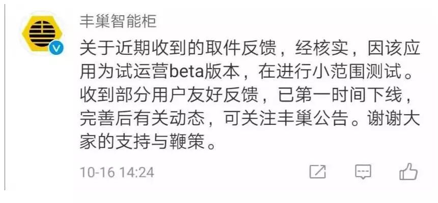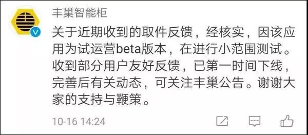 关于近期收到的取件反馈,经核实,因该应用为试运营beta版本,在进行小范围测试。收到部分用户友好反馈,已第一时间下线,完善后有关动态,可关注丰巢公告。谢谢大家的支持与鞭策。