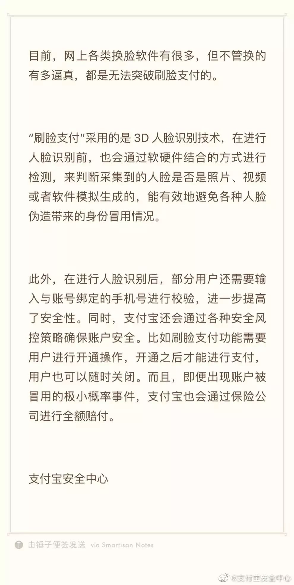 当时,支付宝回应称:支付宝“刷脸支付”采用的是3D人脸识别技术,各类换脸软件有很多,但不管换的有多逼真,都是无法突破刷脸支付的。↓↓