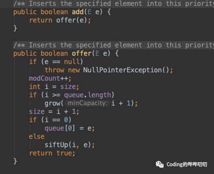 add(E e)和offer(E e)两个方法语义相同,都是向优先队列中插入元素,只是Queue接口规定二者对插入失败时的处理不同,前者在插入失败时抛出异常,后者会返回false。对于PriorityQueue这两个方法其实没什么差别。