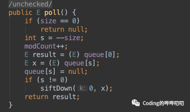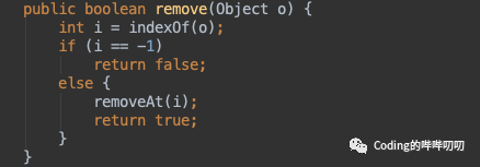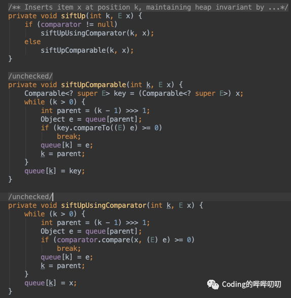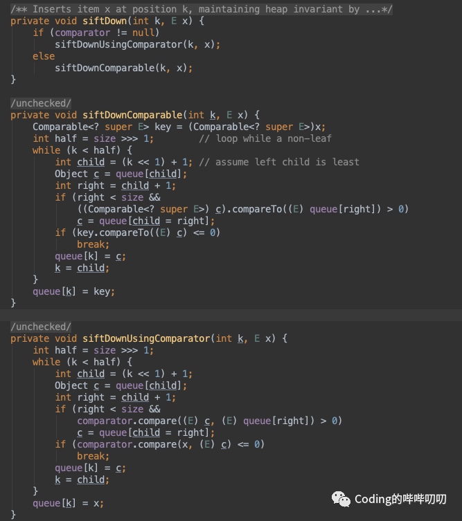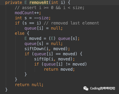 remove(Object o)方法用于删除队列中跟o相等的某一个元素(如果有多个相等,只删除一个),该方法不是Queue接口内的方法,而是Collection接口的方法。由于删除操作会改变队列结构,所以要进行调整;又由于删除元素的位置可能是任意的,所以调整过程比其它函数稍加繁琐。具体来说,remove(Object o)可以分为2种情况:1. 删除的是最后一个元素。直接删除即可,不需要调整。2. 删除的不是最后一个元素,从删除点开始以最后一个元素为参照调用一次siftDown()即可。此处不再赘述。