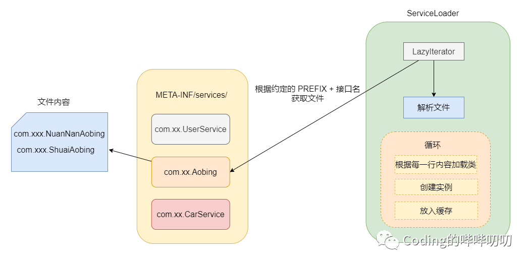目录,再根据接口名找到文件,然后读取文件里面的内容去进行实现类的加载与实例化。
