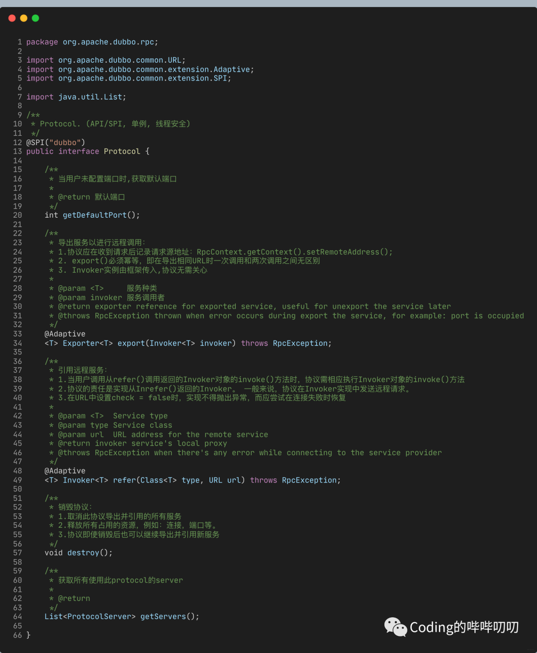 微内核,可插拔,大量的组件,Protocol负责RPC调用的东西,有需要的话,我们也可以实现自己的RPC调用组件,实现Protocol接口,自己实现类即可。