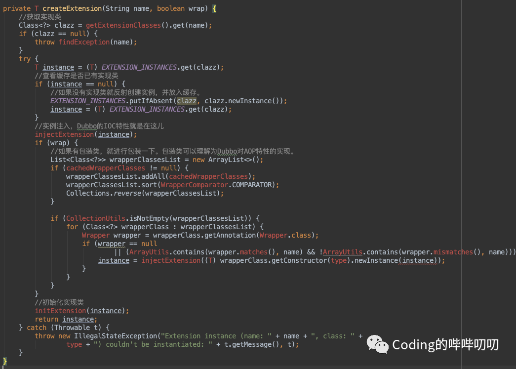 因此就搞了个包装类,Dubbo 里帮你自动包装,只需要某个扩展类的构造函数只有一个参数,并且是扩展接口类型,就会被判定为包装类,然后记录下来,用来包装别的实现类。
