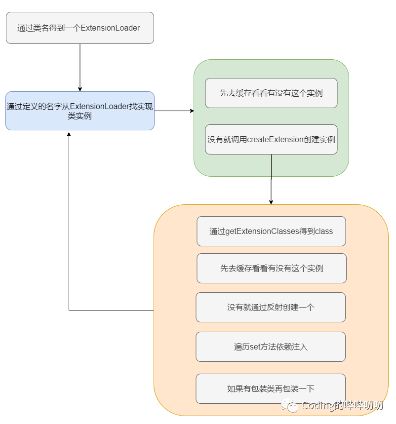 不像 Java 原生的 SPI 那样去遍历加载对应的服务类,只需要通过 key 去寻找,并且寻找的时候会先从缓存的对象里去取,如果取不到就利用反射创建一个实体类。