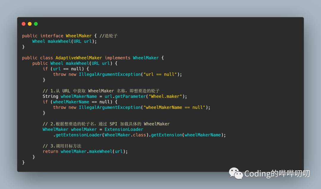 ExtensionLoader.getExtensionLoader(...) 这行代码在Dubbo里大量使用,对很多组件,都是保留一个接口和多个实现,然后在系统运行的时候动态根据配置去找到对应的实现类。如果你没配置,那就走默认的实现。并且 Dubbo SPI 除了可以按需加载实现类之外,增加了 IOC 和 AOP 的特性,还有个自适应扩展机制。