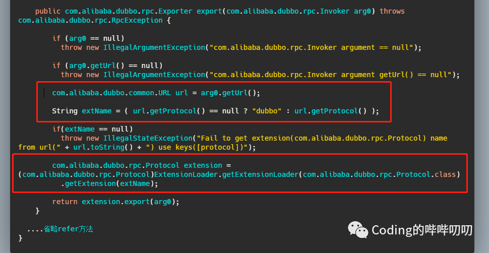 生成代理类,该代理类的那俩方法中会有代理代码,代理代码会在运行时动态根据url中的protocol来获取key(默认是dubbo),也可以自己指定,如果指定了别的key,那么就会获取别的实现类的实例。通过这个url中的参数不同,就可以控制动态使用不同的组件实现类。