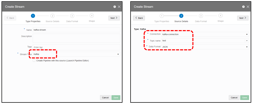 类型选择【kafka】选择之前创建的连接,输入Topic名称,选择数据格式【JSON】。