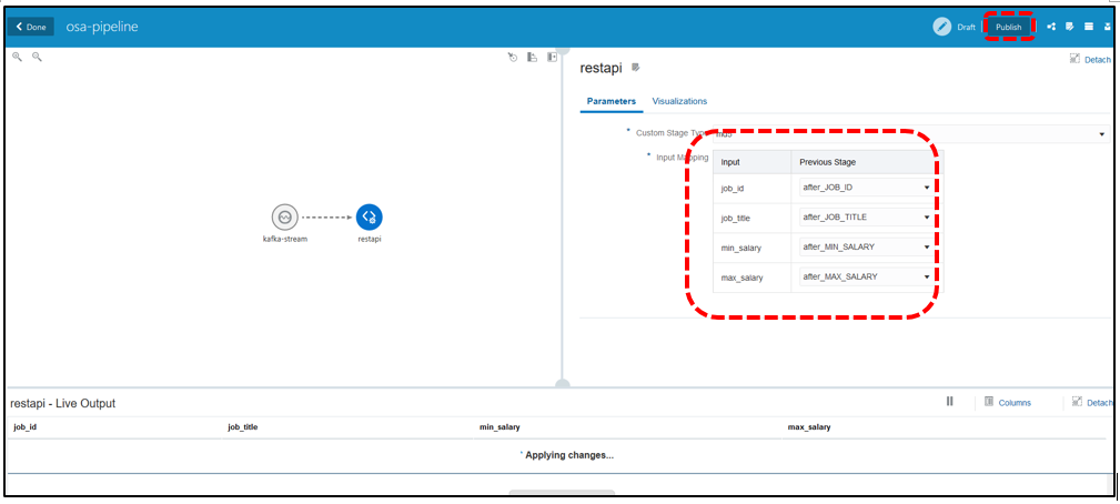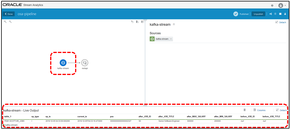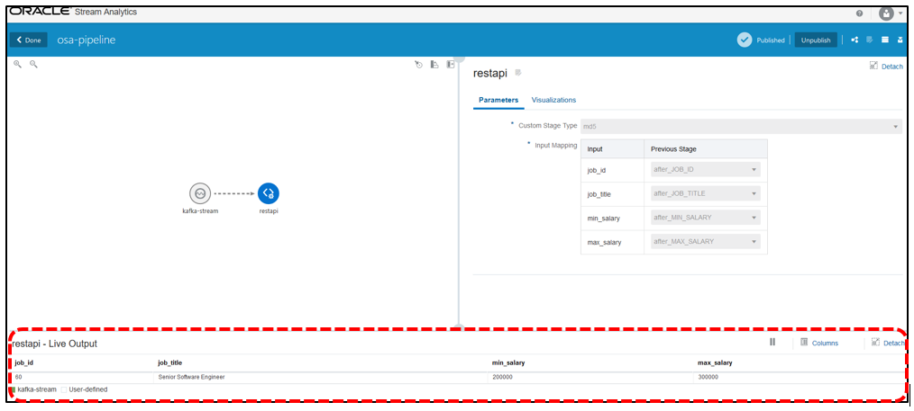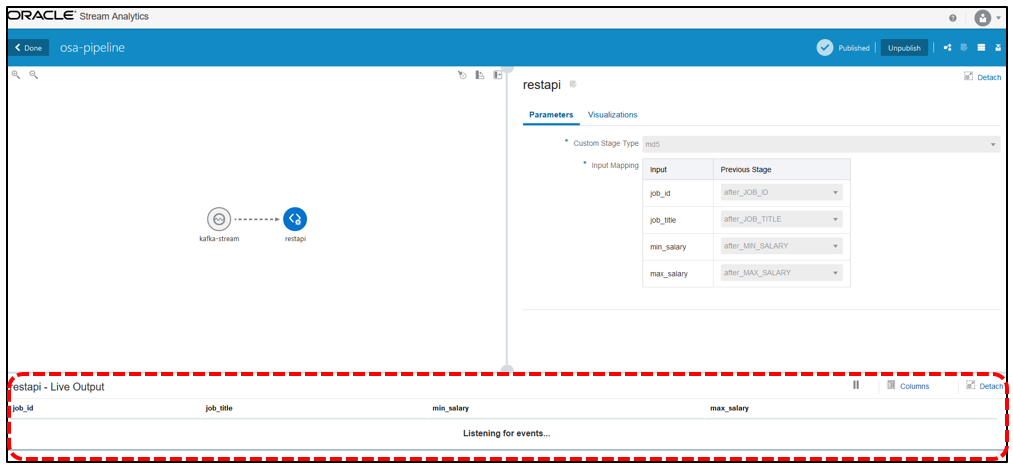 20. 【Publish】的Pipeline将被锁定,如需更改配置点击【Unpublish】进行更改, Publish的Pipeline如下,在下方可以看到实时流数据的监听 :