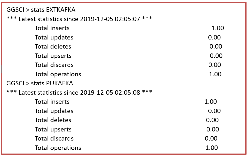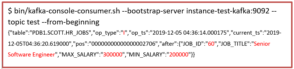 5. Kafka端显示以下记录已经消费,OP_TYPE代表操作类型,