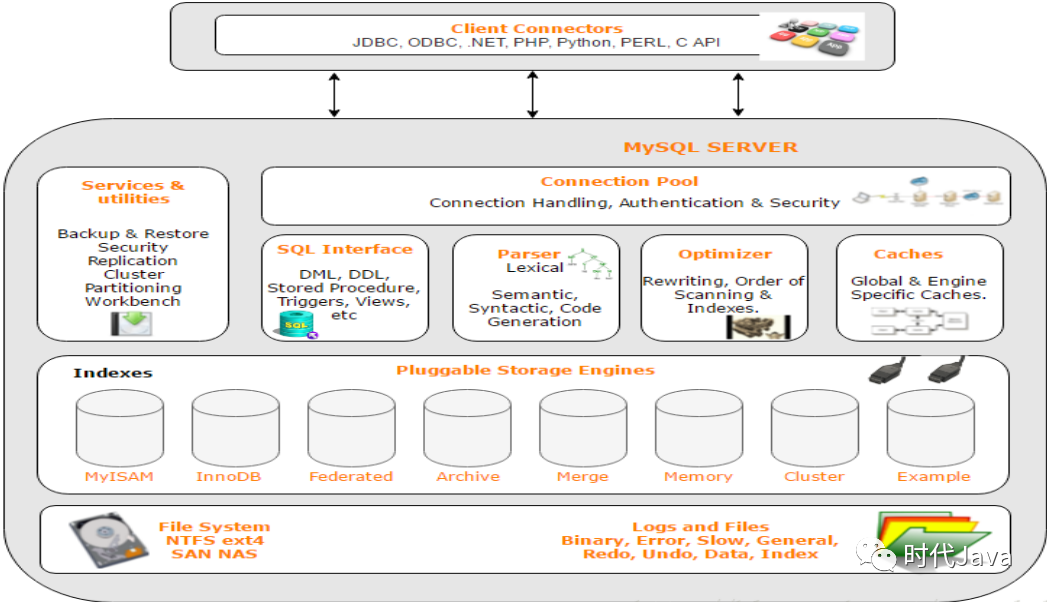 连接层:最上层是一些客户端和连接服务。主要完成一些类似于连接处理、授权认证、及相关的安全方案。在该层上引入了线程池的概念,为通过认证安全接入的客户端提供线程。同样在该层上可以实现基于SSL的安全链接。服务器也会为安全接入的每个客户端验证它所具有的操作权限。