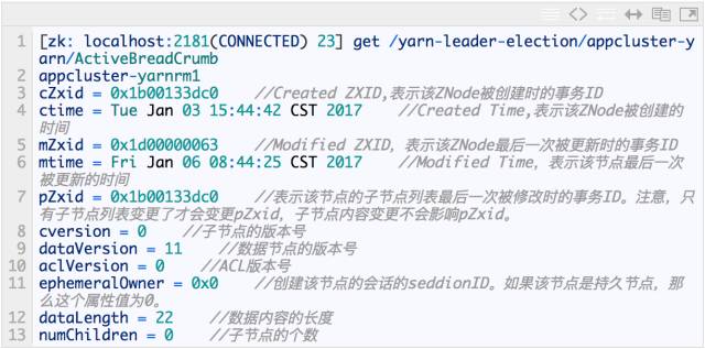 每个 ZNode 除了存储数据内容之外,还存储了 ZNode 本身的一些状态信息。用 get 命令可以同时获得某个 ZNode 的内容和状态信息。如下: