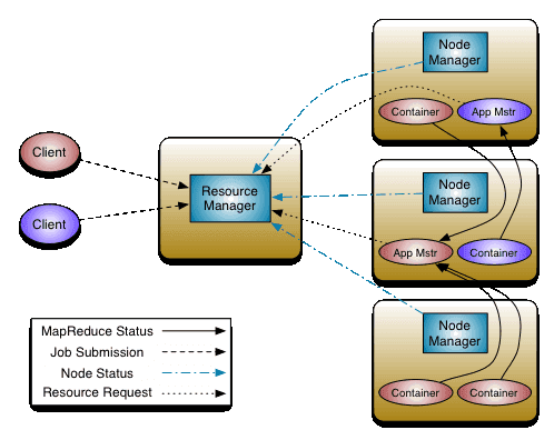 从上图可以看出,YARN主要由ResourceManager(RM)、NodeManager(NM)、ApplicationMaster(AM)和Container四部分组成。其中最核心的就是ResourceManager。