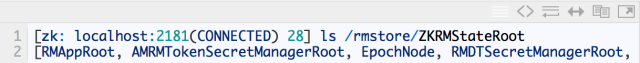 由于这些状态信息的数据量都不是很大,因此 Hadoop 官方建议基于 ZooKeeper 来实现状态信息的存储。在 ZooKeepr 上,ResourceManager 的状态信息都被存储在 /rmstore 这个根节点下面。