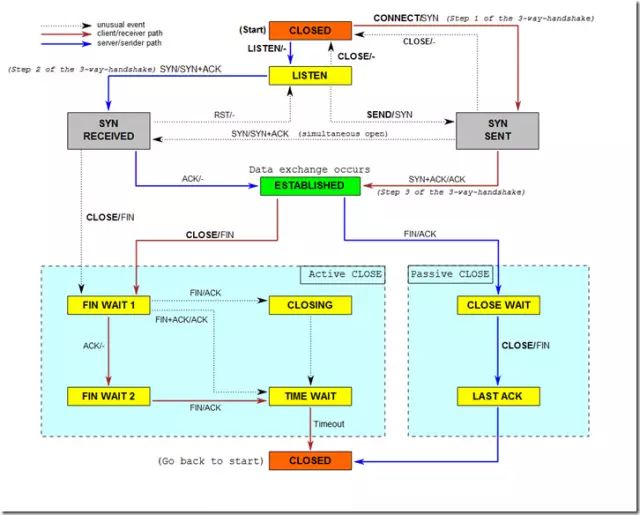 LAST_ACK: 这个状态还是比较容易好理解的,它是被动关闭一方在发送FIN报文后,最后等待对方的ACK报文。当收到ACK报文后,也即可以进入到CLOSED可用状态了。(被动方)CLOSED: 表示连接中断。