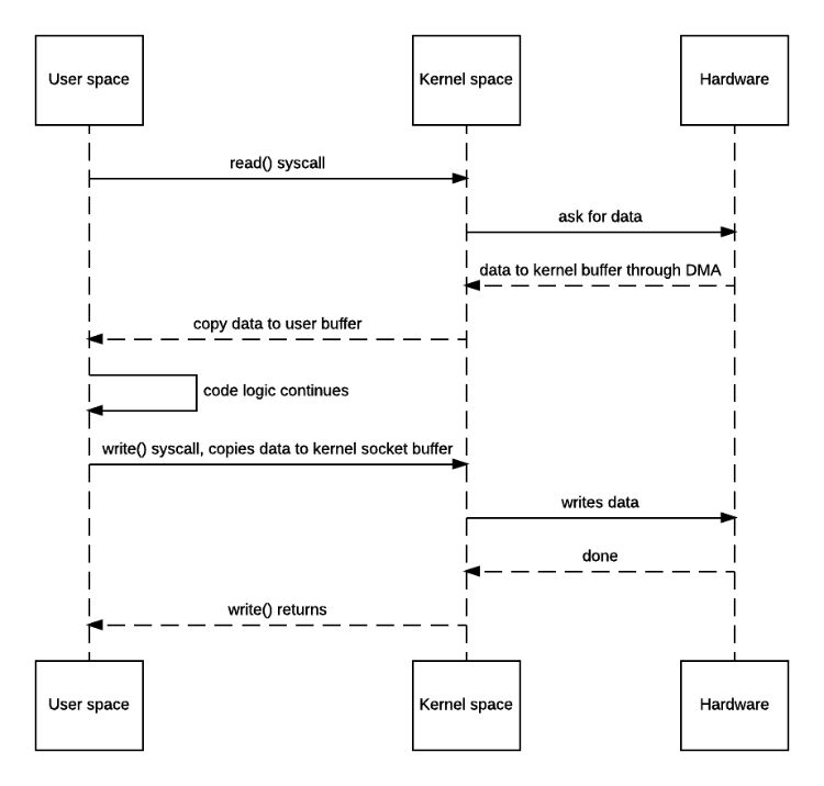 There are use cases where data need to be read from source to a sink without modification. In code this might look quite simple: for example in Java, you may read data from one InputStream chunk by chunk into a small buffer (typically 8KB), and feed them into the OutputStream, or even better, you could create a PipedInputStream, which is basically just a util that maintains that buffer for you. However, if low latency is crucial to your software, this might be quite expensive from the OS perspective and I shall explain.