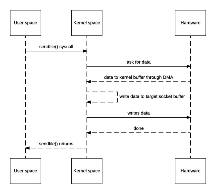 Clearly in this use case, the copy from/to user space memory is totally unnecessary because we didn’t do anything other than dumping data to a different socket. Zero copy can thus be used here to save the 2 extra copies. The actual implementation doesn’t really have a standard and is up to the OS how to achieve that. Typically *nix systems will offer sendfile(). Its man page can be foundhere. Some say some operating systems have broken versions of that with one of them being OSXlink. Honestly with such low-level feature, I wouldn’t trust Apple’s BSD-like system so never tested there.