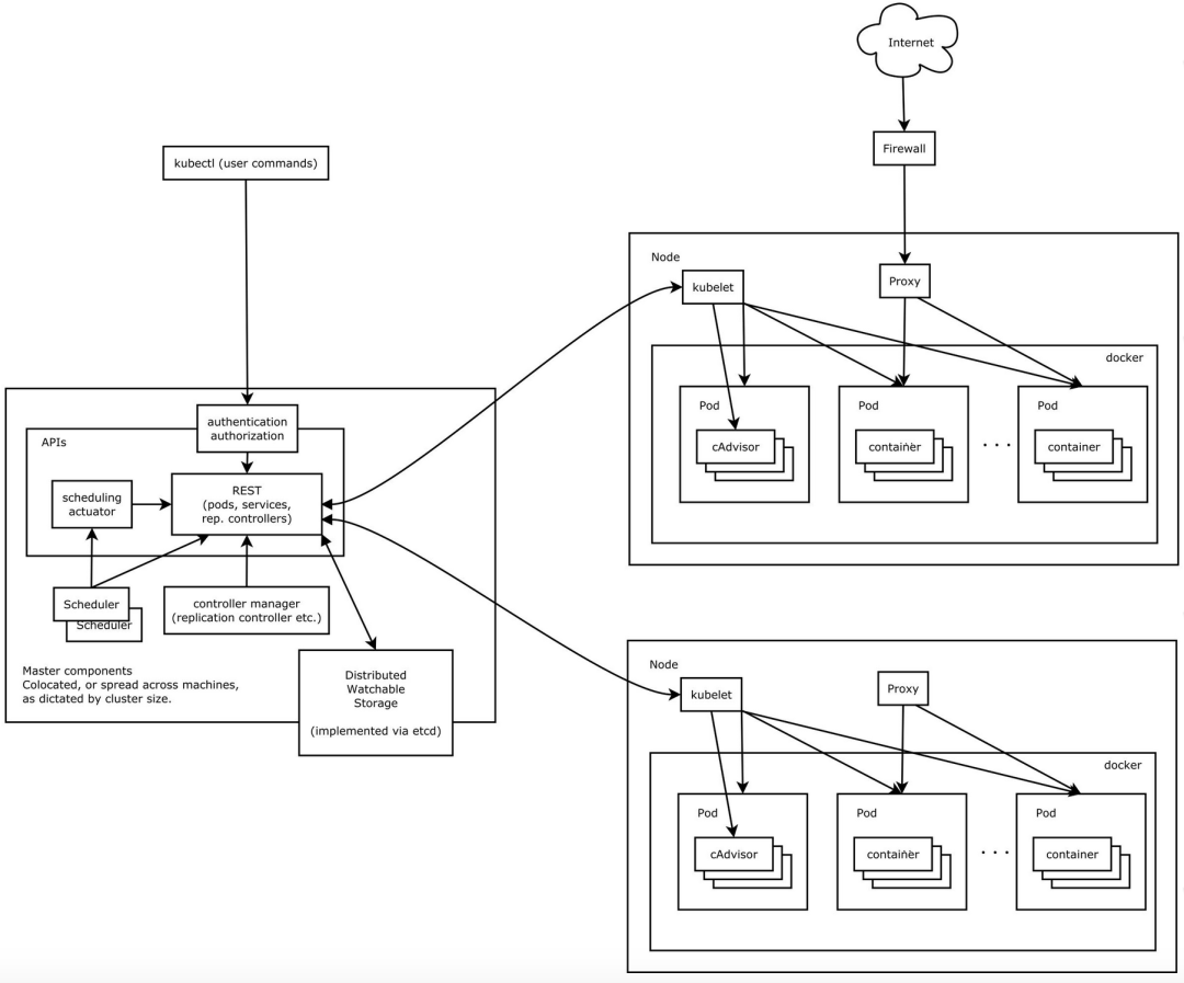 Server进程,Controller Manager服务进程及Scheduler服务进程,关联工作节点Node。Kubernetes API