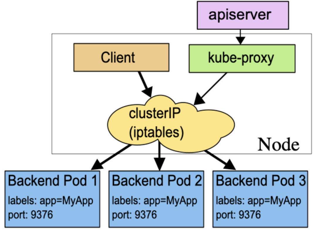 对每个 Service,它会配置 iptables 规则,从而捕获到达该 Service 的 clusterIP 和端口的请求,进而将请求重定向到 Service 的一组 backend 中的某个上面,